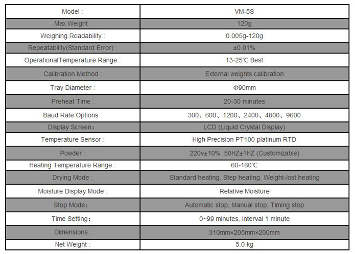 VM-5S Moisture Analyzer distinguish it from other products in that moisture traditional oven drying method is generally used to test a sample of three or even take two or three or four hours and needs by weighing scales, manual calculation, in order to obtain Moisture value (water content) of the sample. Low efficiency of traditional oven method of moisture determination, not able to adapt to the fast pace of production needs. VM-5S high efficiency of the drying heater - high quality ring halogen, samples are quick and uniform heating, water samples continued to be dried. The entire measurement process, rapid moisture analyzer fully automated real-time display of measurement results: Sample weight, moisture content, solids, measurement time, the heating temperature.