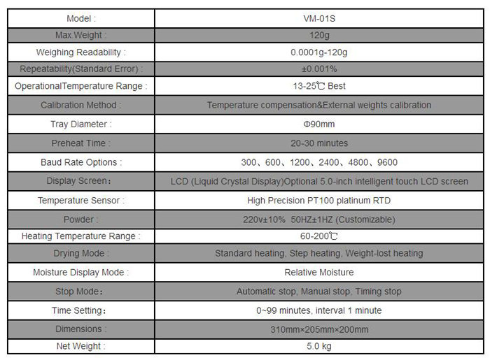 VM-01S Moisture Analyzer distinguish it from other products in that moisture traditional oven drying method is generally used to test a sample of three or even take two or three or four hours and needs by weighing scales, manual calculation, in order to obtain Moisture value (water content) of the sample. Low efficiency of traditional oven method of moisture determination, not able to adapt to the fast pace of production needs. VM-01S high efficiency of the drying heater - high quality ring halogen, samples are quick and uniform heating, water samples continued to be dried. The entire measurement process, rapid moisture analyzer fully automated real-time display of measurement results: Sample weight, moisture content, solids, measurement time, the heating temperature.
